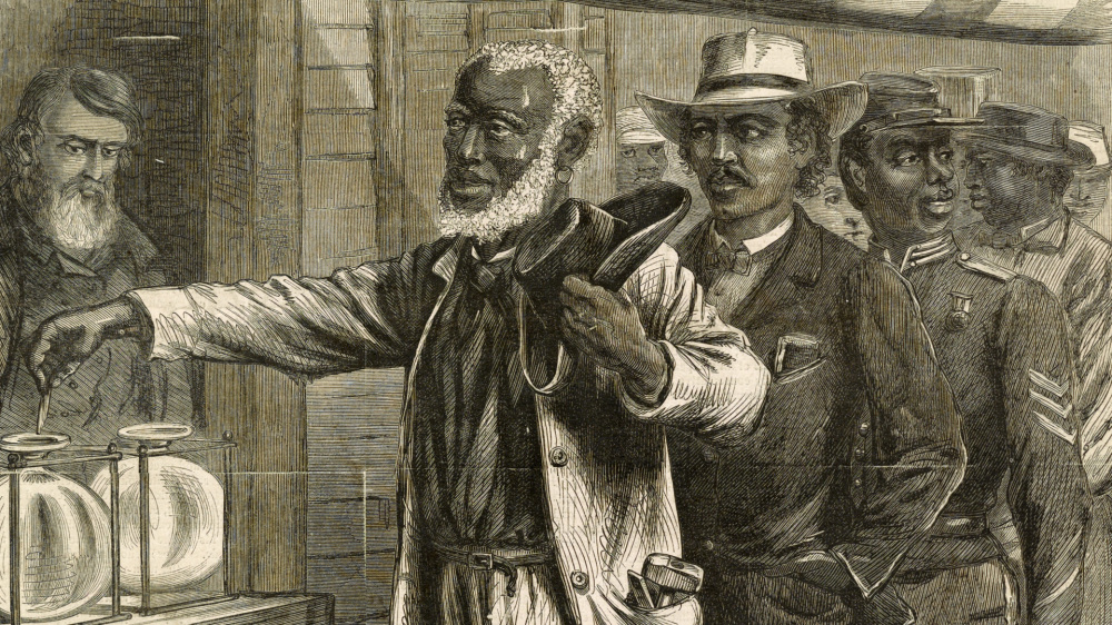 From Harper’s magazine 1867, “The First Vote,” by sketch artist Alfred Waud. The image depicted a line of Black men patiently waiting their turn to vote, a right that was confirmed by the passing of the 15th Amendment to the Constitution. What historian Eric Foner calls ‘the greatest experiment in inter-racial democracy in history’, saw former enslaved men claiming their right of sovereignty by casting ballots in post-war elections. Their ability to vote was soon again rescinded by angry whites who contrived various ‘tests’ to deny Black voters their eligibility, such as the Poll Tax, Grandfather Clause, and Literacy Test. Not until 1965 did the Federal government once again enforce that constitutional right with the Voting Rights of 1965. In 2013 the Supreme Court gutted most of the enforcement provisions of that act, and in recent years a new age of Jim Crow has seen voting and basic rights steadily eroded for Black people.