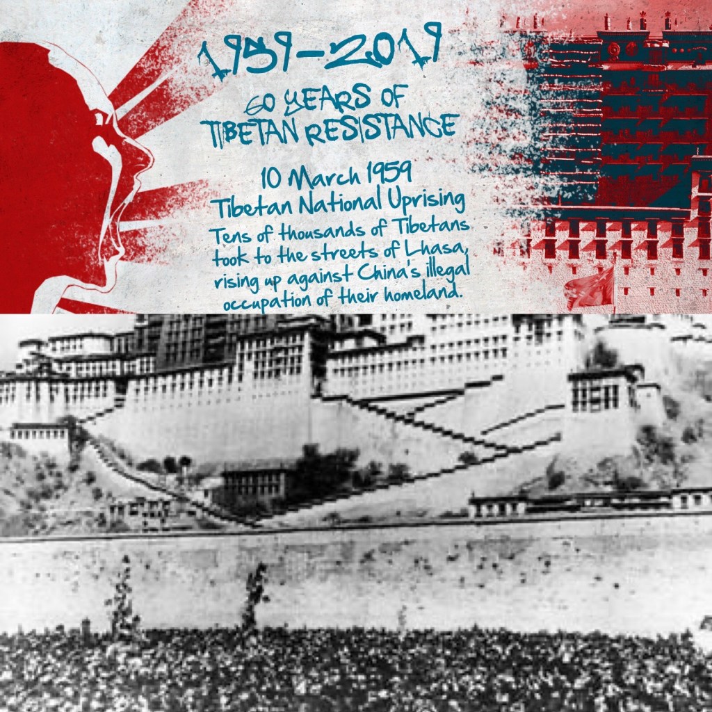 Images from Tibet and 50 years of resistance to China. Below: large crowd of women protestors standing before the Potala Palace, the Dalai Lama’s main residence, in 1959, to protest against Chinese rule. Hours later the Chinese attacked forcing the Dalai Lama to flee. Above: Protest graphic from the 2008-09 Tibetan resistance movement, which gained global attention during the 2008 Beijing summer Olympics.