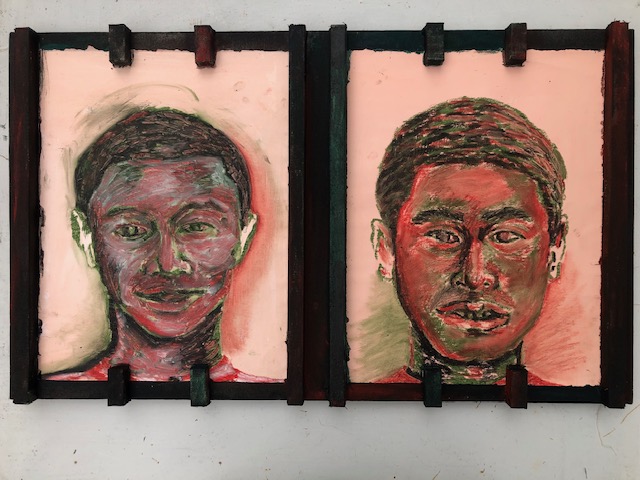 oil stick, acrylic, wood on paper, 19″x32″x1.75.”