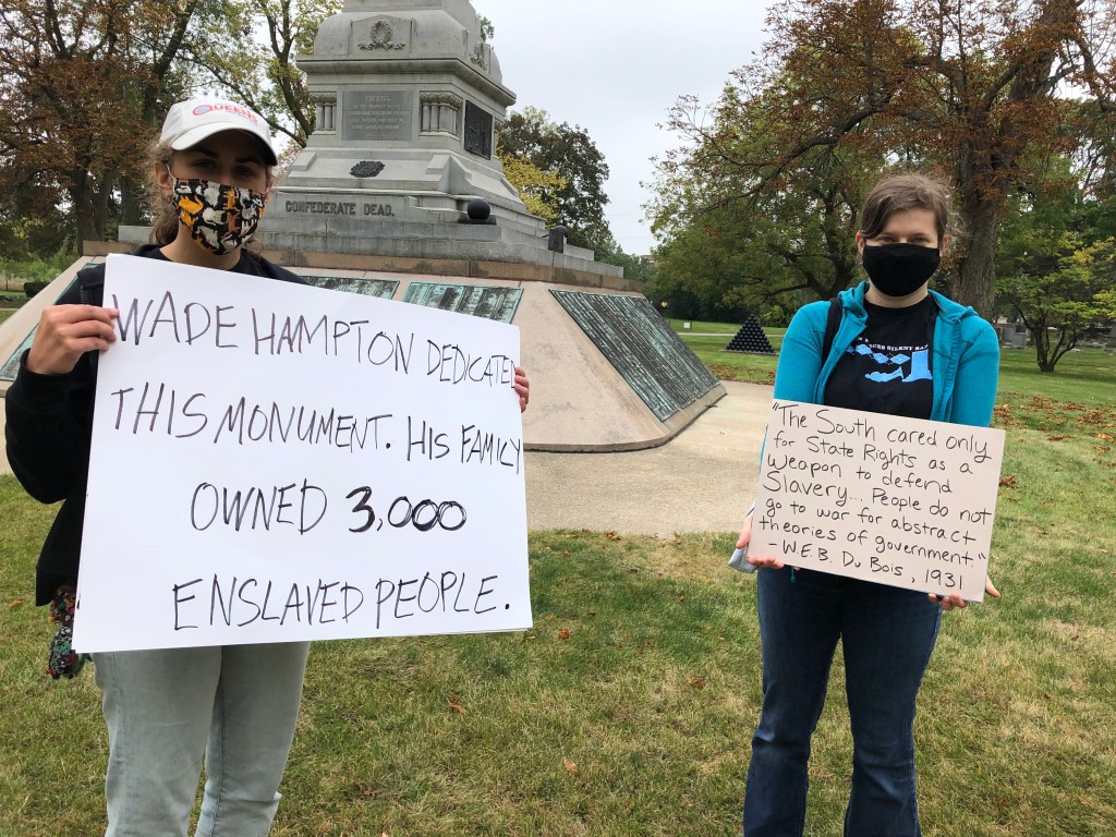 On September 26 Northwestern University doctoral students Hope McCaffrey, left, and Heather Menefee, right, participated in a #WeWantMoreHistory event at Chicago’s Confederate Mound. Writing on behalf of his co-organizers, Greg Downs explains: “At a moment of intense protest against racial injustice, when history and historical monuments have emerged as key flashpoints in political and social debates, [we] wanted to demonstrate that historians can offer clear, concise examples of good history. On September 26, 2020, we, and dozens of other historians, participated in the Civil War history day of action. At historic sites across the United States, participating historians presented evidence to disrupt, correct, or fill out the oversimplified and problematic messages too often communicated by the nation’s memorial landscape.”