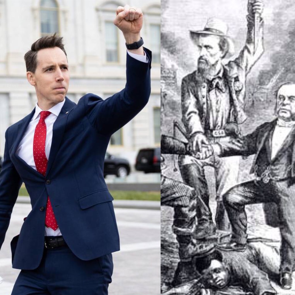 On January 6 2020 a crowd of white supremacists, white nationalists, and self-styled white ‘militias’ staged an insurrection at the U.S. Capitol building in order to prevent the certification of the 2020 presidential election. U.S. Senator Josh Hawley of Missouri (left) saluted the rabble and affirmed their sedition. Not for the first time in U.S. history have elected officials urged domestic terrorists to overthrow constitutional practice. As the Thomas Nast cartoon entitled “This is a white man’s government” from an 1868 issue of Harper’s Weekly suggests, a long tradition of domestic terrorism has reinforced claims of white supremacists to have sole governing authority. “We regard the Reconstruction Acts (so called) of Congress as usurpations, and unconstitutional. revolutionary, and void” read the Democratic Party platform of that year, and white terror groups such as the Ku Klux Klan formed and spread death and terror to enforce the claims of white political leaders. Only the imposition of military rule over the South stemmed (temporarily) the tide of violence.