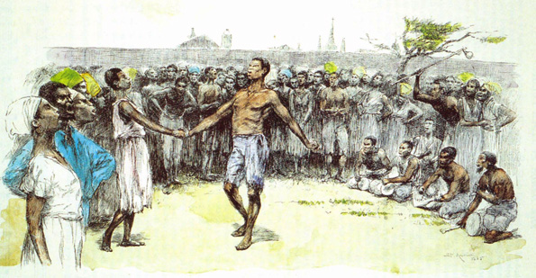 A scene from the Historic New Orleans collection, depicting African and Afro-Creole residents of the city, joined for celebration of traditional dance and music. Here was pastime, carved from the narrows of enslavement, that laid a seedbed for the city’s renowned musical history, and one that would inform generations of popular music and dance in post-slavery America. Louisiana was “thoroughly Africanized” during the early years of its settlement, writes historian Gwendolyn Midlo Hall, and “in Lousiana, it is especially important to avoid treating the formation of slave culture in isolation, as if it were sealed off the from the rest of the society and the world. Culture is a dynamic process.”