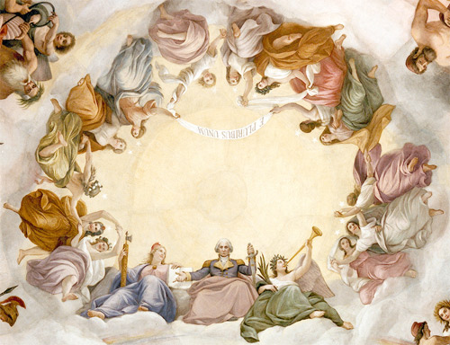 As visitors to the U.S. Capitol building rotunda look upwards to the domed ceiling 180′ high above their heads, their gaze is met by “The Apotheosis of George Washington,” a spectacular 1865 fresco painting by Constantino Brumidi. Covering more than 4,000 square feet of the domed surface, the scene depicts George Washington in “apotheosis,” a greek word that means ascending to heaven like a god. Washington is flanked by a bevy of female forms, including, to either side of him, Liberty and Fame, along with 13 angelic beauties who complete the divine circle, each of whom represent one of the 13 colonies from the American Revolution. Bathed in mystic heavenly grandeur, the deified Washington represents the merging of the secular with the sacred in the casting of mythic national and imperial histories.